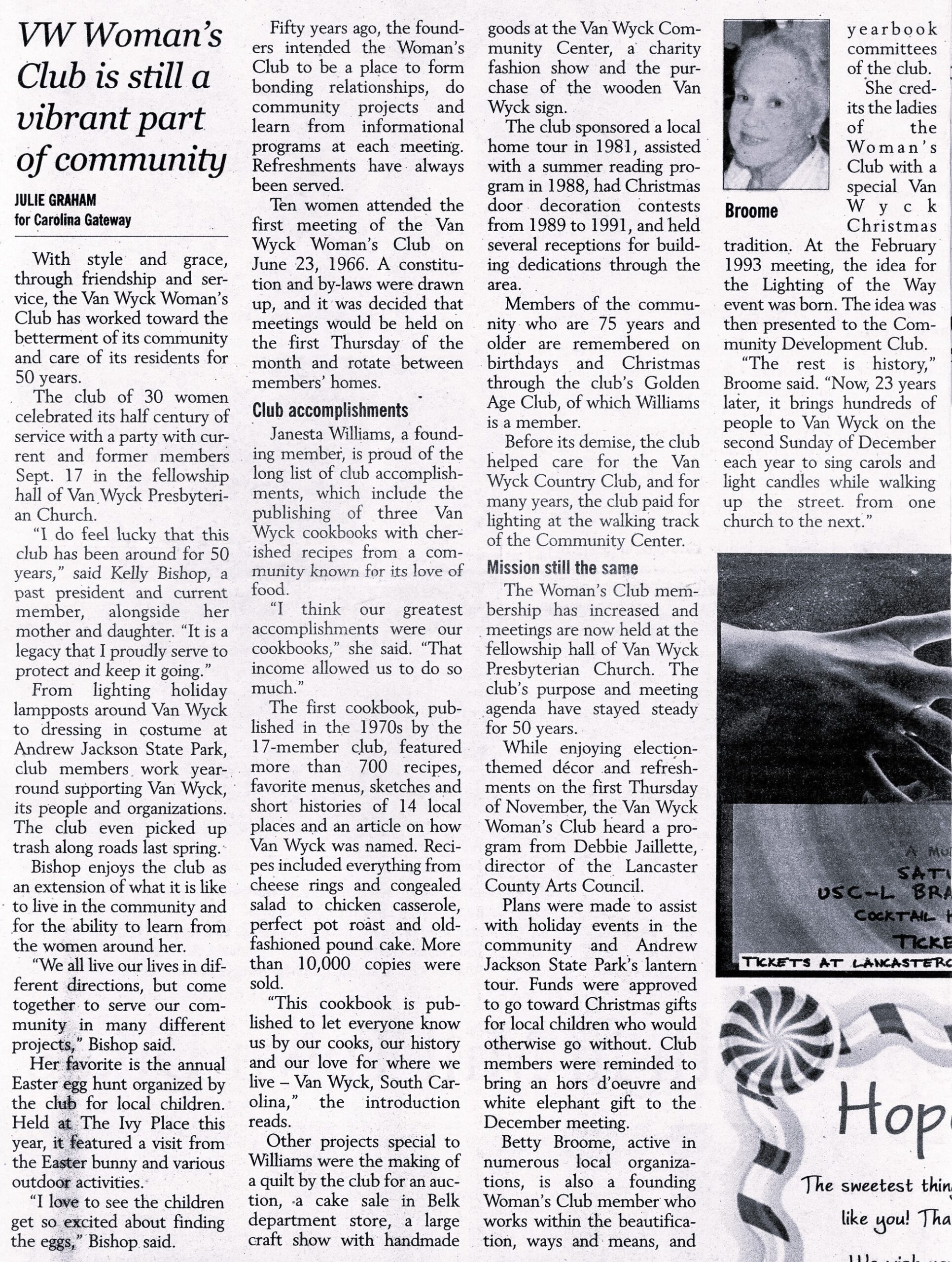 Van Wyck Women's Club celebrates 50 years 1st Row: Claudia Thompson, Eloise Williams, Loyrece Elmore, Kelly Bishop, Jane Massey, Betty Broome, ???, Janesta Williams, ???2nd Row: Hannah Bishop, Annette Denton, Patti Awbrey, Donna Fox, Lena Watson, Toug Brunson, Pat Oglesby, Susan Detwiler, Lisa Essex, Linda Vaughan3rd Row: Lane Ardrey, Laura Ledford, ??? December 28, 2016 - Carolina Gateway